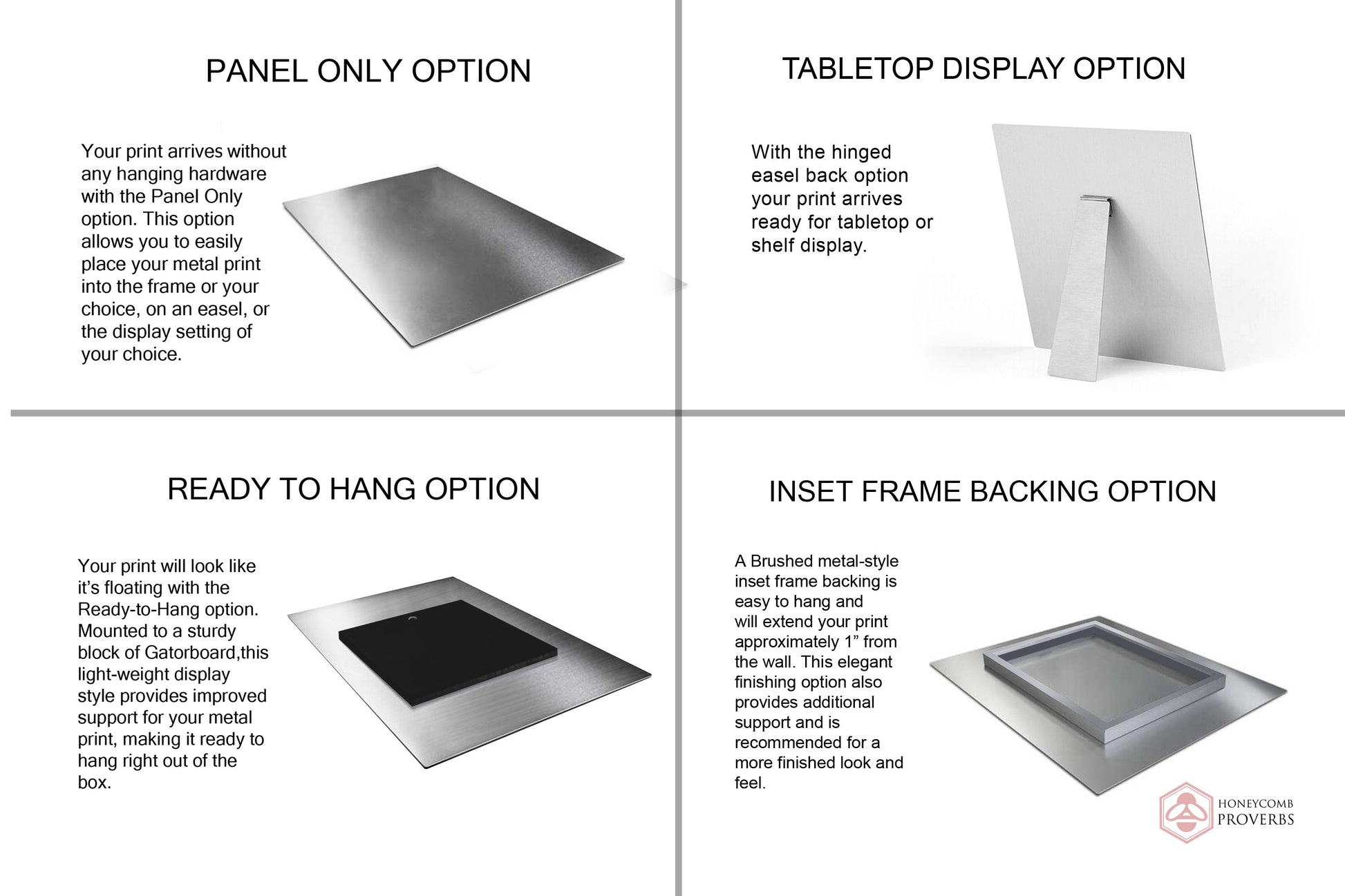 • Two hanging options: Choose from Gatorboard Float backing for an economical hanger, or Metallic Inset-Frame backing for a more finished look and feel.